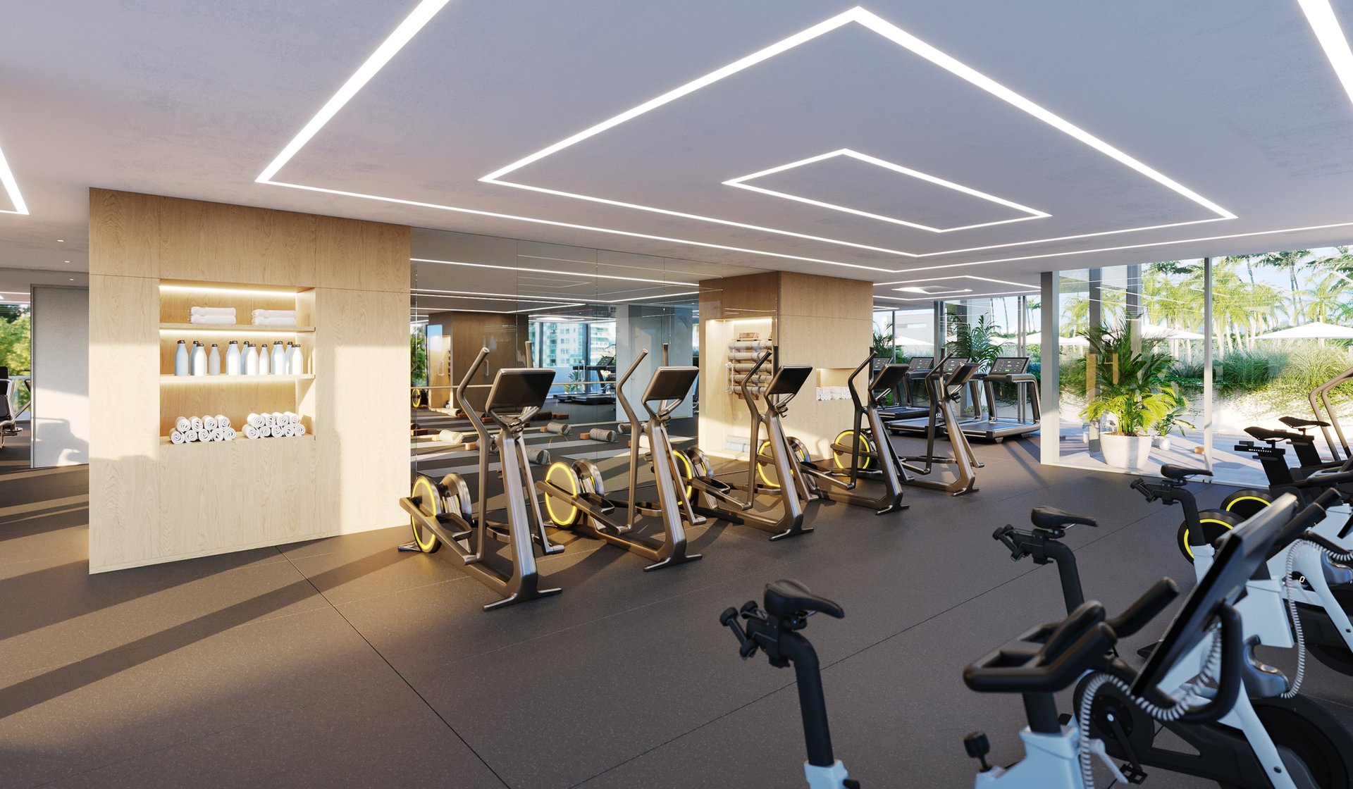 Fully-outfitted gym with yoga studio and outdoor fitness area.