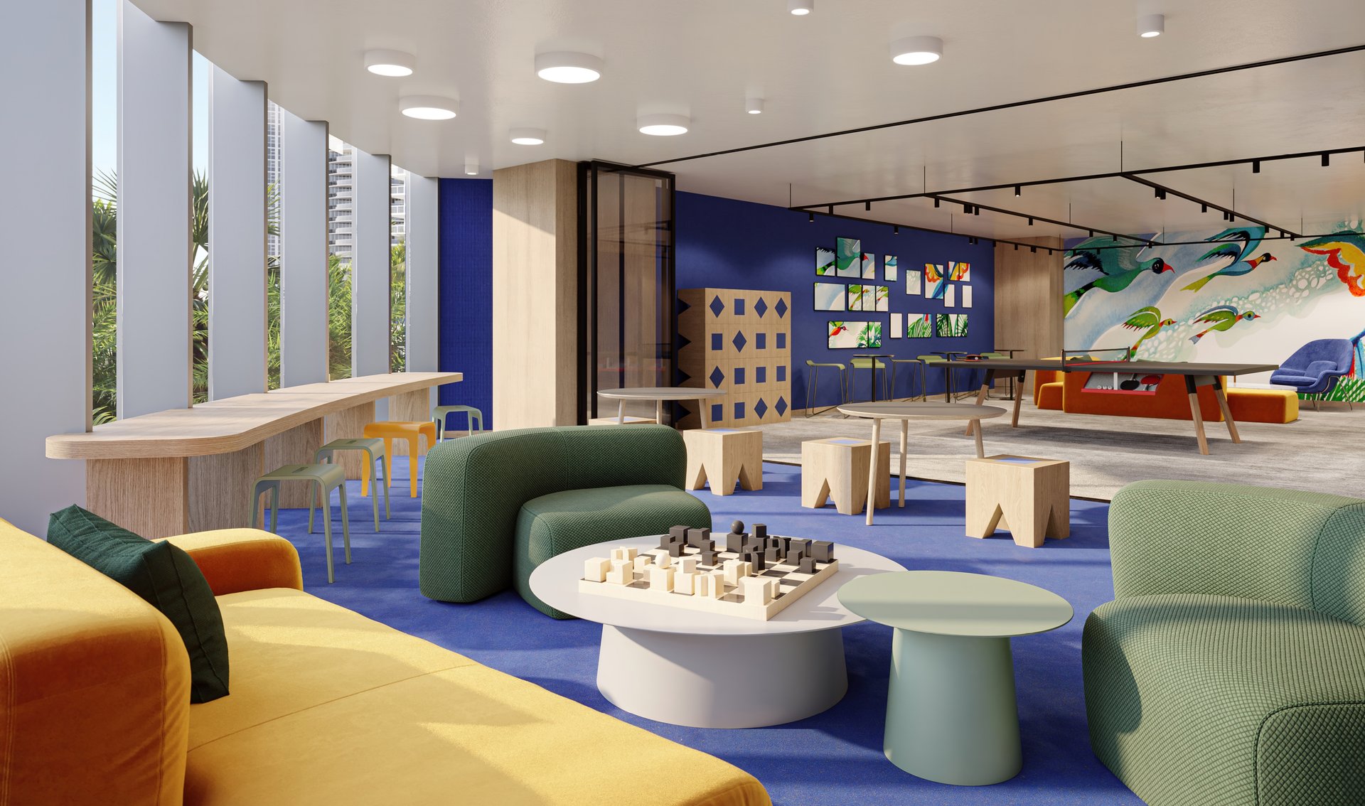 Business lounge with co-working areas, private offices, and board rooms.